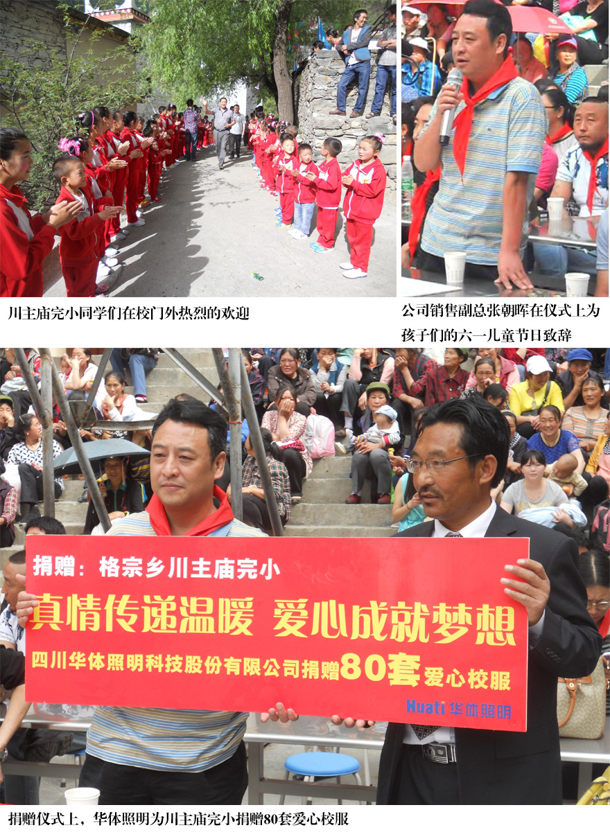 5月30日,四川華體照明科技股份有限公司銷售副總張朝暉一行來到四川省丹巴縣格宗鄉(xiāng)絨壩溝的川主廟完小,與該校同學(xué)們共同慶?!傲粐H兒童節(jié)”,并為該校學(xué)生送去了華體的愛心——捐贈(zèng)80套愛心校服,情暖校園。